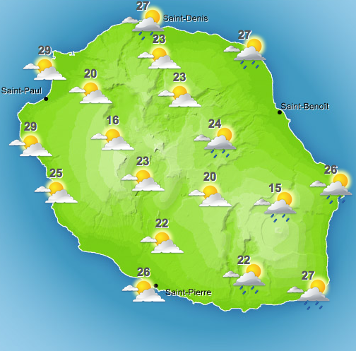 Les températures maximales atteignent 28 à 30°C sur le littoral, 24 à 25°C dans les cirques, 17° au Volcan et 29°C à Saint-Denis.