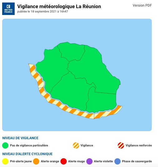 L'ouest et le sud de La Réunion ne sont plus en en vigilance vagues-submersion depuis 16 heures du matin ce lundi 20 septembre 2021. L'alerte avait été déclenché après qu'un train de houle de Sud-Ouest soit arrivé ce dimanche en cours de journée. "Cette houle s'est amplifiée au cours de la nuit en atteignant un pic de 4,50 mètres note Météo France. Ce lundi matin des vagues atteignant parfois les 4 mètres de haut déferlent de la Pointe des Aigrettes (saint-Gilles) à La Pointe de La Table (Saint-Philippe), en passant par la Pointe au Sel (Saint-Leu). Cette houle commencera à s'amortir à la mi-journée et passe sous les 4 mètres en cours d'après-midi. "Sauf évolution contraire, la vigilance sera levée ce lundi à 16h" indiquent les météorologues (Photo d'illustration rb/www.ipreunion.com)