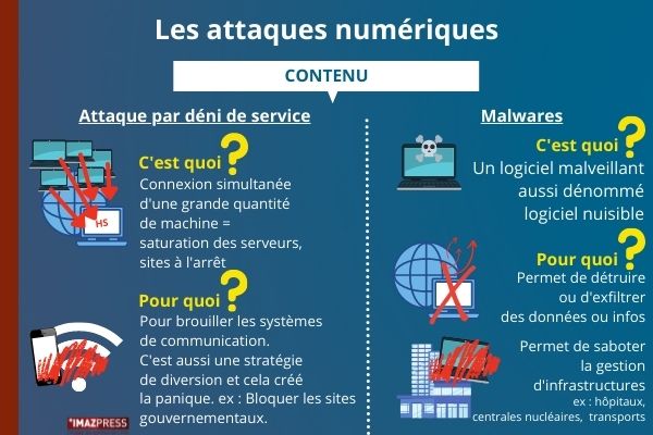 Logiciels malveillants, désinformation, réseaux sociaux, piratage, E-bomb, bienvenue à l'heure de la cyber-guerre. Alors que les bombardements pleuvent sur l'Ukraine depuis le début de la guerre contre la Russie, une toute autre guerre a lieu en souterrain. "Les armes numériques peuvent créer le chaos, et les Etats ne sont pas préparés à une guerre d'une telle ampleur", assure Béatrice Ghorra, enseignante à l'école de guerre économique, située à Paris. Emmanuel Macron a d'ailleurs annoncé dans une allocution ce mercredi 2 mars 2022 que "nous ne pouvons pas dépendre des autres pour nous défendre que ce soit sur terre, en mer ou dans le cyberespace". Face à la multiplication des attaques numériques, le conflit russo-ukrainien s'inscrit dans une guerre 3.0 aux allures de romans de science-fiction.. (Photo d'illustration rb/www.ipreunion.com)