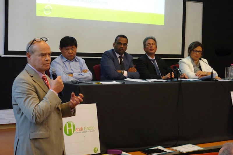 La mission "Handi-Pacte", lancée en avril 2015 par le fonds pour l'insertion des personnes handicapées dans la fonction publique (FIPHFP), donnait rendez-vous ce vendredi 24 septembre 2015 à l'IAE, école universitaire de management, pour la signature de deux conventions avec le CHU de La Réunion et le Centre de gestion de la fonction publique territoriale. De nombreux élus, directeurs de service et directeurs des ressources humaines étaient présents pour s'informer sur les moyens d'accès à l'emploi pour les personnes en situation de handicap