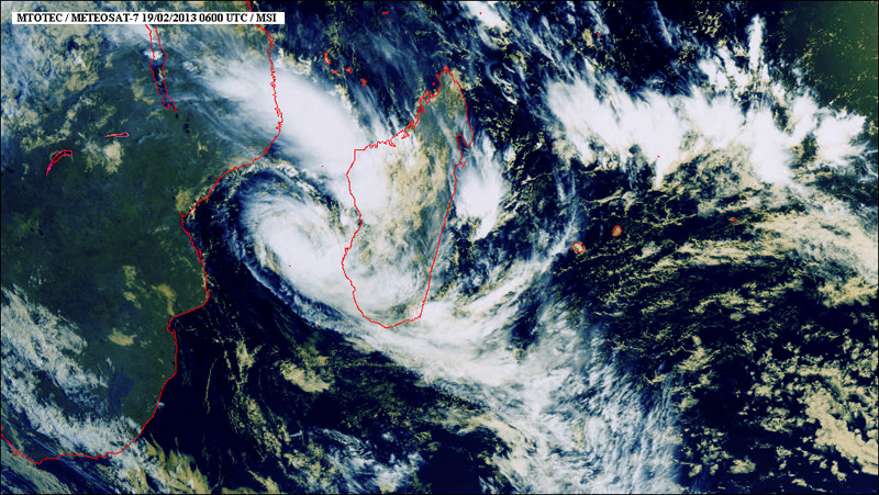 A 16 heures ce mardi 19 février 2013, la tempête tropicale modérée Haruna était située à 1 450 km à l'ouest de La Réunion, soit par les points 21.5 Sud et 41.2 Est. Le système se déplace le long d'une trajectoire sud à la vitesse de 9 km/h, et ne représente aucune menace cyclonique pour le département dans les prochaines 72 heures. (image satellite www.mtotec.com)