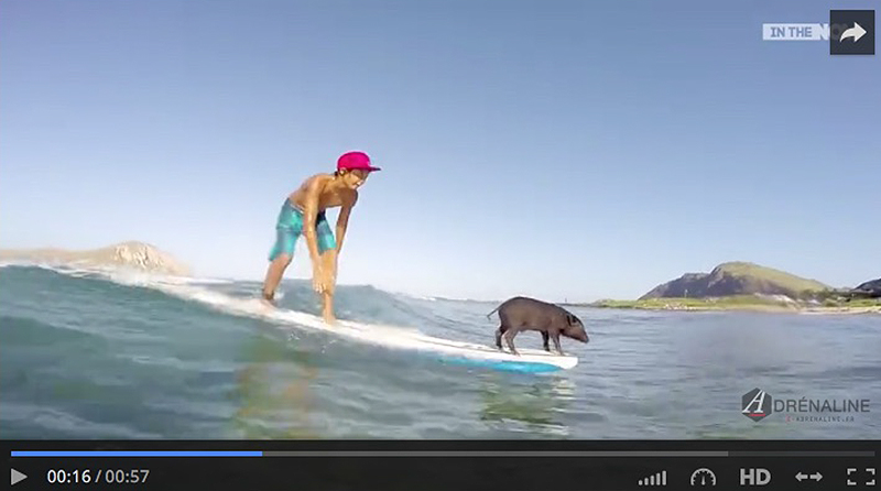 La vidéo fait le tour des réseaux sociaux, un jeune cochon sans peur ni phobie, est filmé en peine session de surf à Hawaï. Fièrement dressé à la proue de la planche, il glisse avec aisance sur les vagues à peine guidé par les surfeurs à deux jambes qui se font skipper pour l'occasion. L'intrépide cochonnet est le digne fils de Kama, le papa cochon surfeur déjà star des spots de Hawaï (Capture d'écran lequipe.fr)