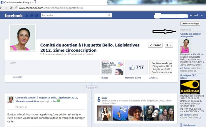 C'est dans un courrier transmis à la presse qu'un citoyen de Saint-Paul annonce que la candidate Huguette Bello a acheté un lien sponsorisé sur la page de son comité de soutien. "Mme Bello a utilisé les moyens commerciaux qu'offre Facebook en matière de publicité en achetant (à très haut tarif) des liens sponsorisés. C'est ainsi que des milliers d'internautes ont pu voir ce lien publicitaire aux cotés d'autres publicités pour lingerie fine ou de ventes par correspondance de jouets pour adultes...", indique ce citoyen."Il n'est pas interdit pour un candidat d'ouvrir des sites internet spécifiques pour la campagne électorale, ils peuvent également utiliser leurs sites personnels dans un but de propagande électorale. Les sites interactifs (les blogs) sont assimilés, en l'état actuel de la jurisprudence, à des sites internet ordinaires", souligne-t-il.