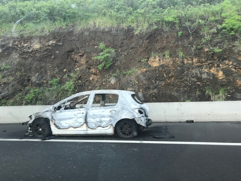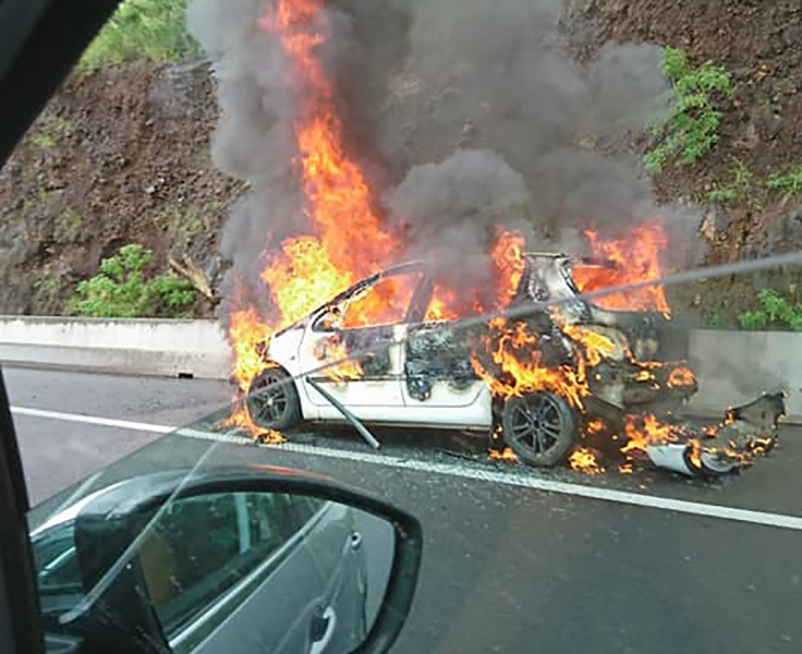 Ce samedi 27 janvier 2018, une voiture a pris feu en début d'après-midi sur la route des Tamarins dans le sens Saint-Pierre/Saint-Paul peu avant le viaduc de la ravine Trois Bassins. Les passagers du véhicule étaient sortis avant que le feu ne se déclare. Deux véhicules du Service Départemental d'Incendie et de Secours de La Réunion (SDIS 974) sont en cours d'intervention. (photo rb/www.ipreunion.com / radar 974)