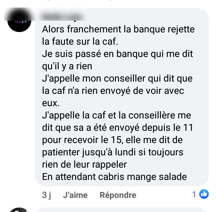 Plusieurs des clients sont contrariés, expliquent n’avoir aucune explication, hormis le fait que, « selon la banque, il n’y a rien, c’est la Caf qui n’aurait pas envoyé le paiement ». Cette même jeune femme indique sur les réseaux avoir eu la Caisse d’allocations familiales, lui expliquant que « cela a été envoyé depuis le 11 septembre ».