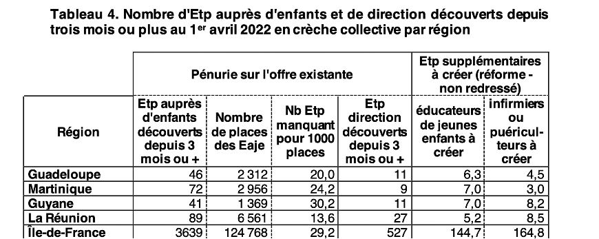 Selon une enquête de la CAF publiée début juillet, 48,6 % des établissements des 8.000 établissements répondants déclarent un manque de personnel auprès des enfants. À La Réunion, ce manque est également présent. Selon les données de l’INSEE, il manquerait 13,6 Etp (l’Etp étant une mesure proportionnelle au nombre d'heures travaillées par un salarié).
