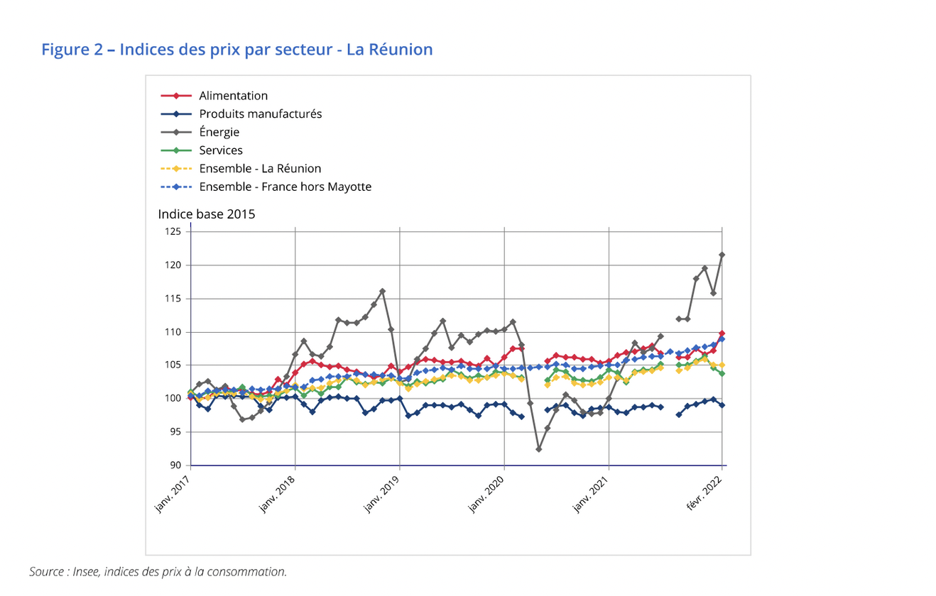 Si la hausse des prix de l’énergie s’accélère de nouveau à La Réunion avec + 18,0 % sur un an, après + 15,8 % en janvier, elle demeure moindre qu’en France (+ 21,1 %). Dans une moindre mesure, les prix de l’alimentaire accélèrent également avec la forte hausse des produits frais en février. Par ailleurs, la hausse des prix se poursuit pour le tabac (+ 5,2 %) et les produits manufacturés (+ 1,1 %) malgré un recul pour l’habillement et les chaussures. Les prix des services reculent légèrement (- 0,1 % sur un an après + 0,4 % en janvier et + 3,0 % en décembre) : les prix du transport aérien augmentent de manière plus contenue en raison du contexte sanitaire local, et le recul des tarifs des services de santé se poursuit.