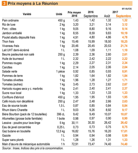 "En septembre 2017, les prix à la consommation baissent de 0,4 % à La Réunion. Cette baisse s'explique essentiellement par des baisses saisonnières dans les produits manufacturés, ainsi que dans les transports aériens de voyageurs. Elle est en partie compensée par une hausse des prix des produits pétroliers. Sur un an, les prix augmentent de 0,2 % à La Réunion et de 1,0 % en France" résume l'Insee (Institut national de la statistique et des études économiques) dans sa dernière note parue ce mercredi 18 octobre dont nous publions la suite dans son intégralité ci-après.