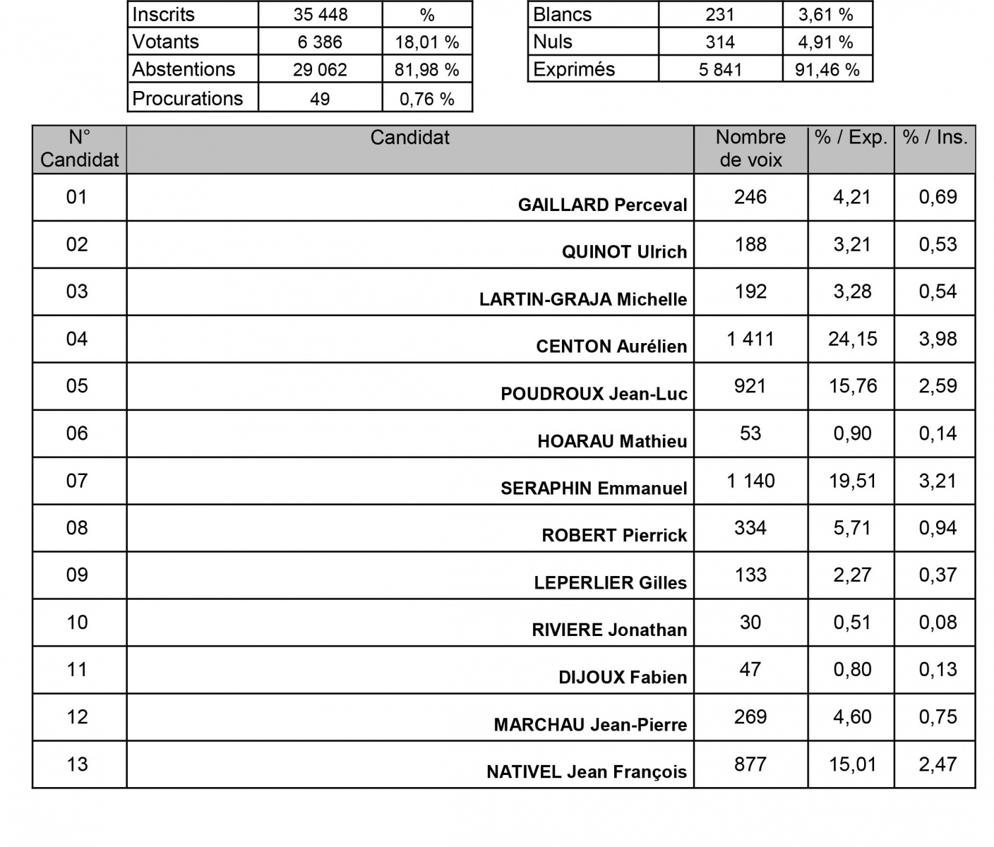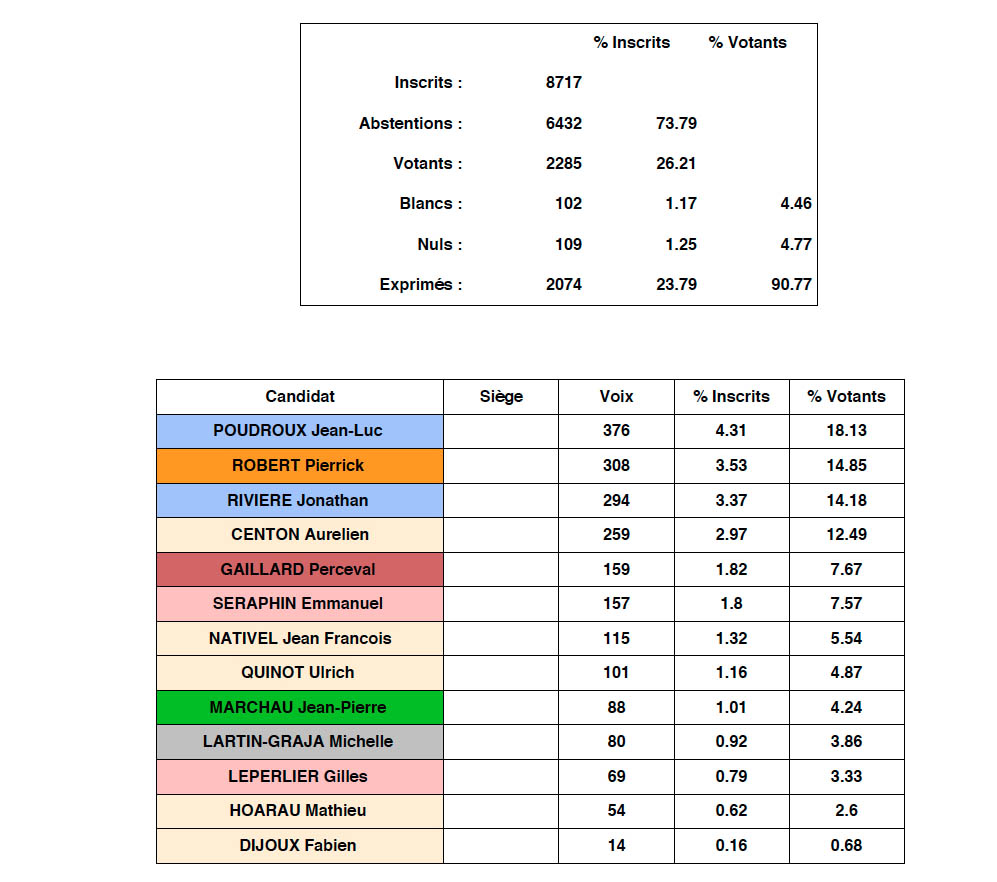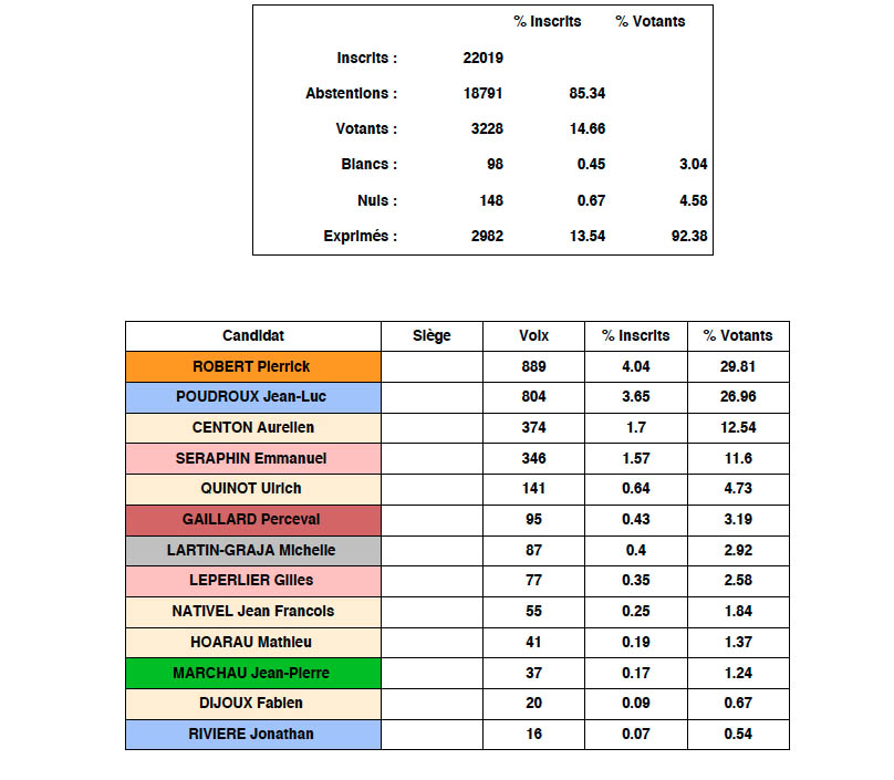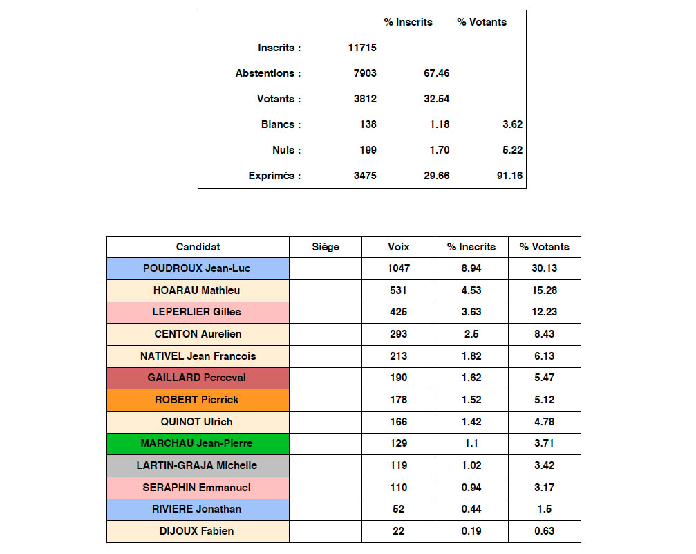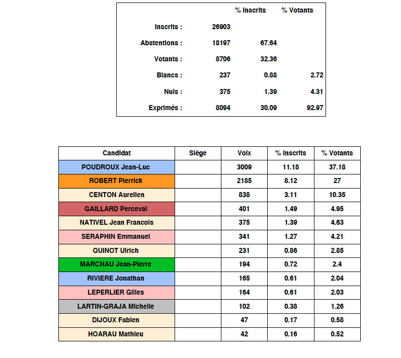 D'après les tendances, les deux candidats qualifiés au second tour sont : Jean-Luc Poudroux et Pierrick Robert. Les résultats définitifs ne devraient plus trop tarder
