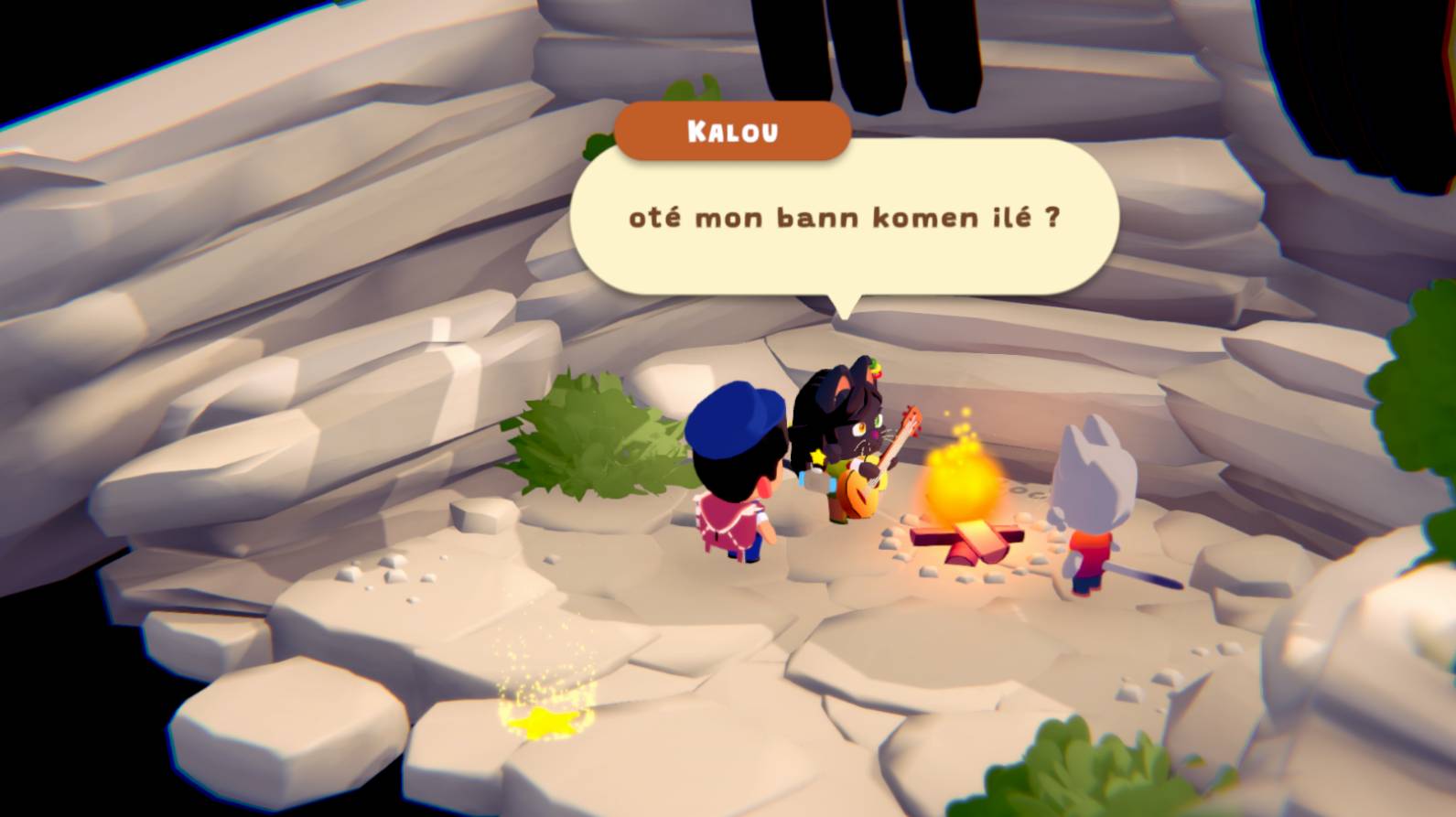 Alors, le jeu est joli, mais bon ce sont des décors lambda de jeu vidéo en 2,5D, sans aucune personnalité, et dans la centaine de jeux qui sortent chaque semaine, ça se démarque pas. Et les habitants de Mafate sont tous des animaux anthropomorphes ? Est-ce que Mafate est peuplé uniquement de gens d'animal crossing ? Et en plus des animaux anthropomorphes, il y a des animaux animaux ? Et pourquoi tous ces drapeaux reunionnais ? On dort vraiment dans des drapeaux la rényon en guise de hamac là-haut ?