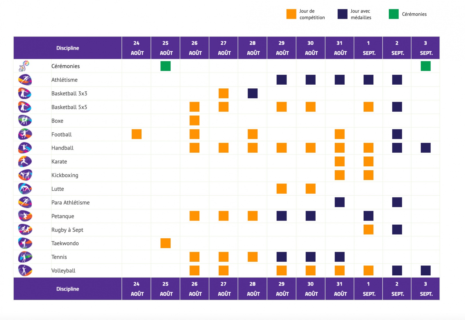 Athlétisme et handisport, basket 5x5 et 3x3, boxe, badminton, tennis de table, football, cyclisme, natation et handisport, haltérophilie, handball, judo, lutte, rugby à 7, karaté, pétanque, tennis, volley, kickboxing ettaekwendo sont les sports représentés. Voici d'ailleurs le calendrier des compétitions.