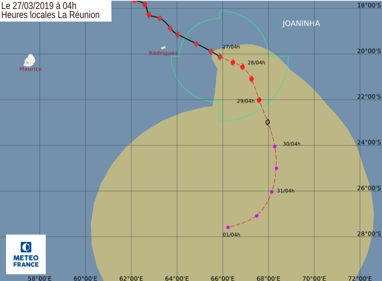 Le cyclone intense Joaninha poursuit sa route et continue de s'éloigner de Rodrigues. A 16 heures mardi 27 mars 2019, il se trouvait à 120 kilomoètres à l'est de Pointe Cotton toutes les alertes cycloniques ont été levées sur l'île.