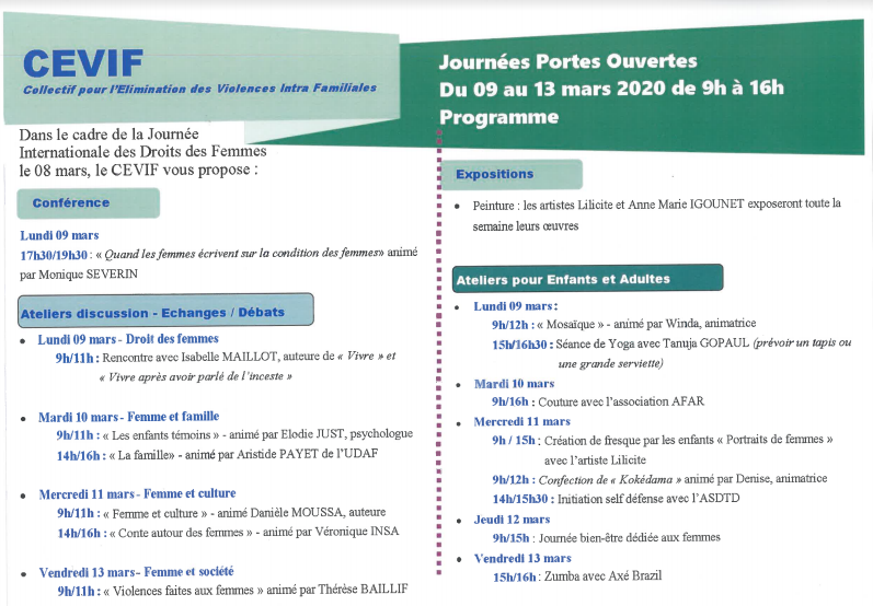 A l'occasion de la Journée internationale des droits des femmes qui est célébrée le 8 mars, le CEVIF qui lutte contre les violences intrafamiliales organise ses portes ouvertes du 9 au 13 mars 2020. Au programme : des ateliers échanges et débats, des expositions mais aussi des animations plus ludiques dédiées notamment aux enfants. Retrouvez le programme complet ci-dessous. (Photo rb/www.ipreunion.com)