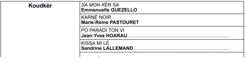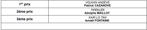 *En outre, Cette année le jury a distingué, dans la catégorie « fonnkèr », l’ensemble des textes de Loïc FRANCHITTI, qui se voit se voit décerner une mention « KOUDKÈR ÉSPÉSYAL FONNKÈR» du jury pour les fonnkèr ci-après : AN SILANS / TI PÈR / BATAR MOIN NANA / MON PAROL LÉ GRAN / ZAM KOUKOUN