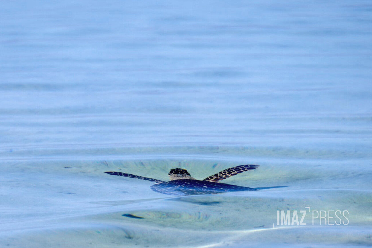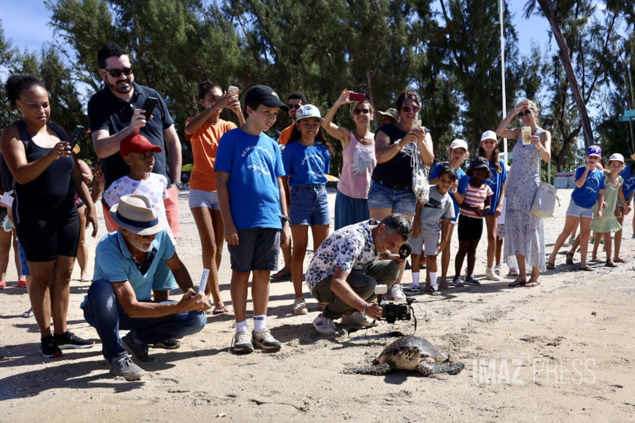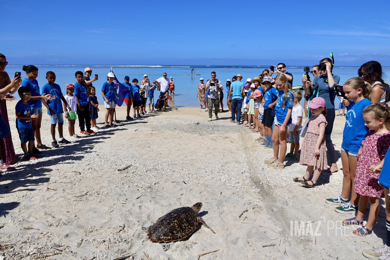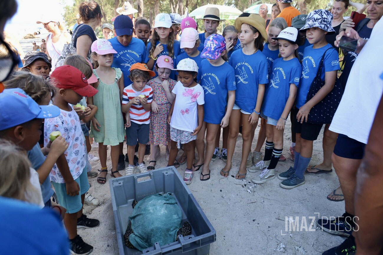 Ce jeudi 15 février 2024, Epoi, jeune tortue imbriquée retrouve l'océan. C'est à l'Hermitage - devant le poste des Maîtres nageurs sauveteurs, que les enfants de l'Air Marine éducative de la Saline ont pu accompagner la tortue jusqu'à l'eau. Récupérée en novembre par le Centre de soins de Kélonia, Epoi avait un fil de pêche et un hameçon au niveau du côlon (Photos : sly/www.imazpress.com)