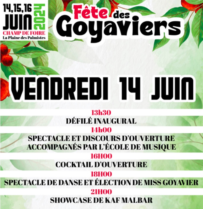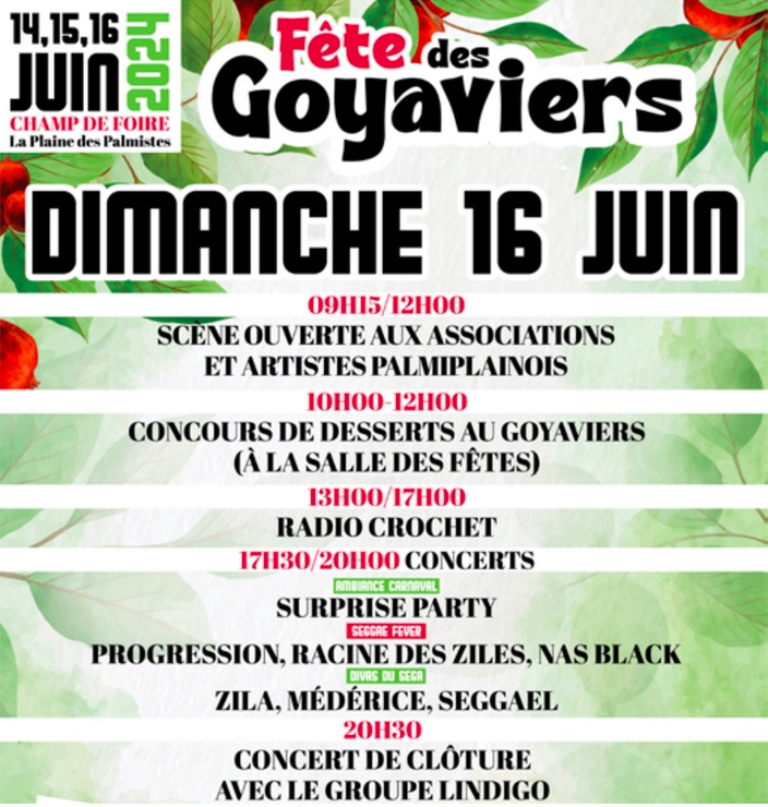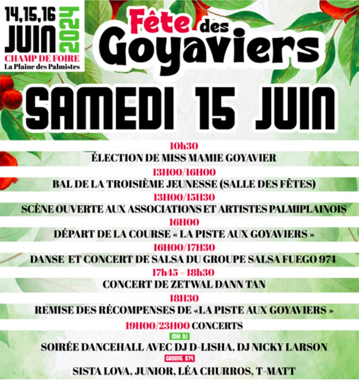 Le dimanche se tient le concours de dessert au goyavier, dont l’inscription est ouverte (voir la page Facebook de la Fête des goyaviers), mettant en avant le goyavier dans sa déclinaison sucrée. Le jury veillera à ce que le goyavier soit la base du dessert ou prépondérant dans la proposition. Il sera composé d’élus et de jeunes avec la participation de Brice Vizler (champion du monde Boulangerie abilympics 2023).