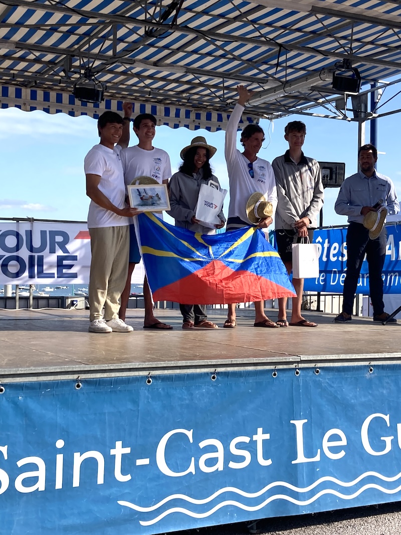 À l’issue d’une ultime journée de régate pour le Grand Prix de la Région Bretagne ce dimanche 14 juillet, l’équipage La Réunion composé d’Aurélien Barthélémy, de Gabriel Jean-Albert, de Noémi Gicqueau et de Léo Jean-Albert, se classe 4ème de l’édition 2024 du Tour Voile. (Photo : Ligue de Voile de La Réunion)