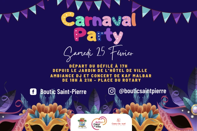 La Ville de Saint-Pierre organise sa « Carnaval Party » le samedi 25 février à vivre entre amis ou en famille. Masque blanc, cape longue, tricorne ou encore costume d'Arlequin… Soyez créatifs et inspirés afin d’être les plus beaux pour le grand défilé! Au programme, nous nous engageons à vous offrir un moment joyeux et festif avec :