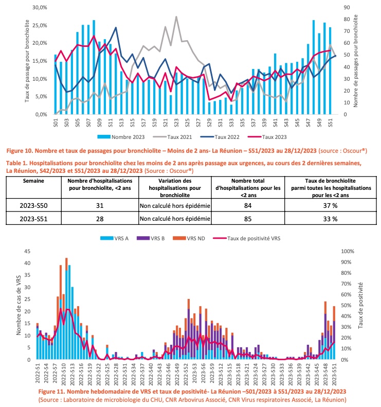 Si la hausse de la circulation virale du VRS se confirme en S52, La Réunion va probablement entrer dans un contexte d’épidémie de bronchiolite en début d’année 2024.