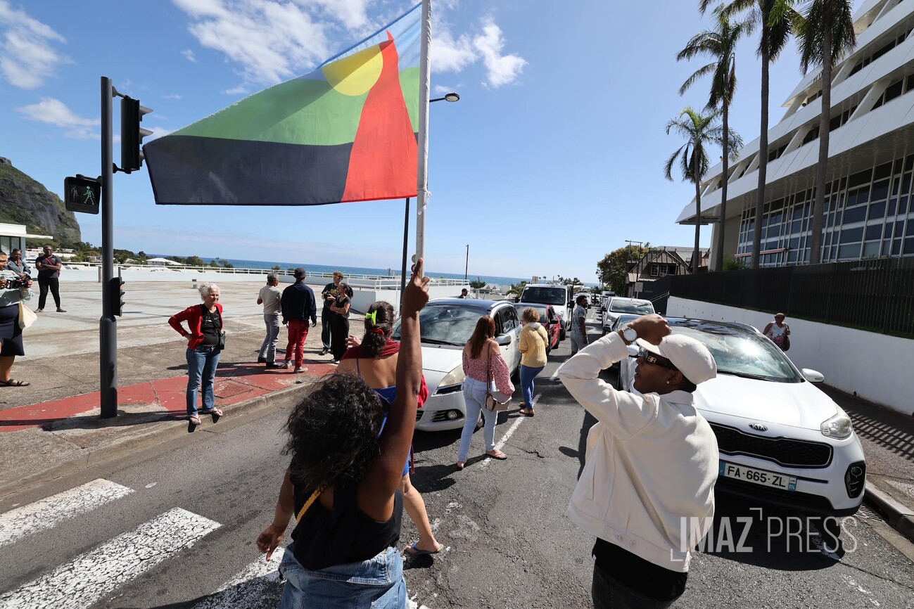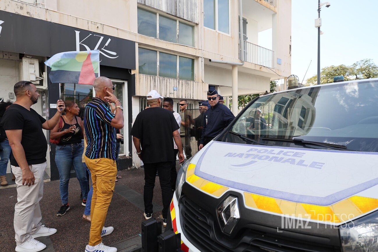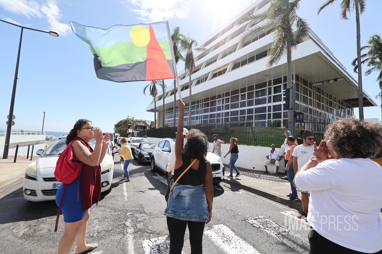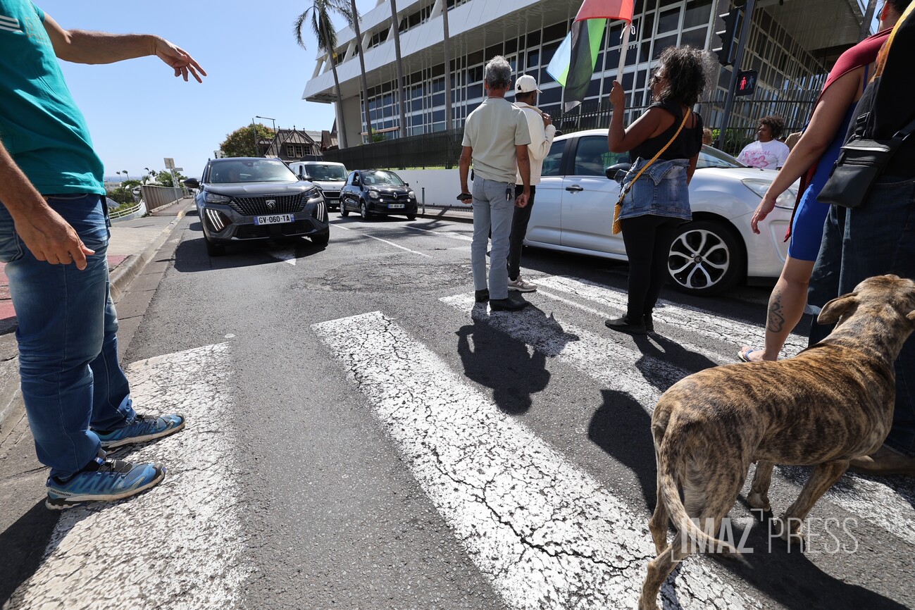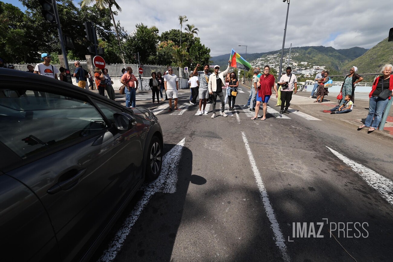Une trentaine de personnes manifestent devant la mairie de Saint-Denis ce mardi 5 août 2025 en soutien aux habitants de la Colline. Les manifestants réclament une rencontre avec la maire, deux semaines après la démolition de trois maisons du quartier, qui avait été endommagées pendant le cyclone Garance. La ville, de son côté, dénonce "des accusations graves et mensongères" (Photo sly/www.imazpress.com)