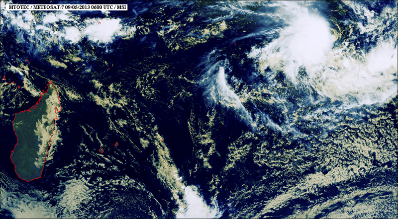 Une dépression tropicale qui s'est formée dans le sud-ouest de l'océan Indien n'a pas beaucoup évolué au cours de la journée de ce jeudi 9 mai 2013. À 16 heures elle se trouvait toujours à 3 570 km à l'est-nord-est des côtes réunionnaises. Elle était déjà à cette distance dans la matinée. Le système a par contre légèrement incurvé sa trajectoire et se déplace maintenant vers le sud est à la vitesse de 13 km/h. Près du centre de la dépression les vents soufflent à 65 km/h avec des rafales atteignant 85 km/h. Selon Météo France, le système dépressionnaire devrait se renforcer et atteindre le stade de tempête tropicale modérée ce samedi 11 mai et celui de forte tempête tropicale ce dimanche 12 mai. Les météorologues n'envisagent aucune alerte cyclonique d'ici les prochaines 72 heures. Il est rare qu'un système dépressionnaire de cette importance se forme à cette période de l'année (Image satellite : http://www.mtotec.com/).