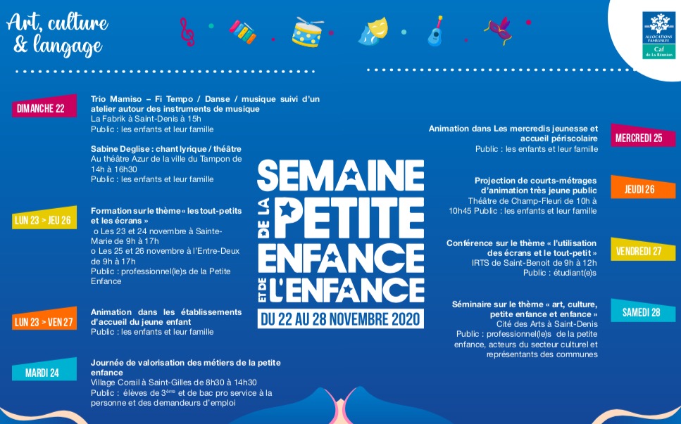La Caf a impulsé, coordonné et principalement financé cette action partenariale. Du 22 au 28 novembre 2020, plusieurs centaines d’acteurs de la petite enfance et de l’enfance vont se mobiliser autour d’une thématique commune, l’art, la culture et le langage. Cet événement va mobiliser l’ensemble des intervenants réunionnais (social, économique, public) liés à la petite enfance et à l’enfance au travers de 4 grands axes.