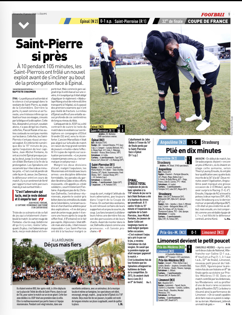 La presse nationale ne cache pas son amertume, le Figaro titre "Coupe de France : cruel épilogue pour la Saint-Pierroise", le quotidien de rappeler l’héroïsme de nos joueurs péi "les Réunionnais de la Saint-Pierroise, club de Régionale 1 (6e échelon), ont frôlé l'exploit, mais fini par s'incliner samedi à Epinal (N2, 4e division) 1-0 après prolongation en 16e de finale de la Coupe de France."