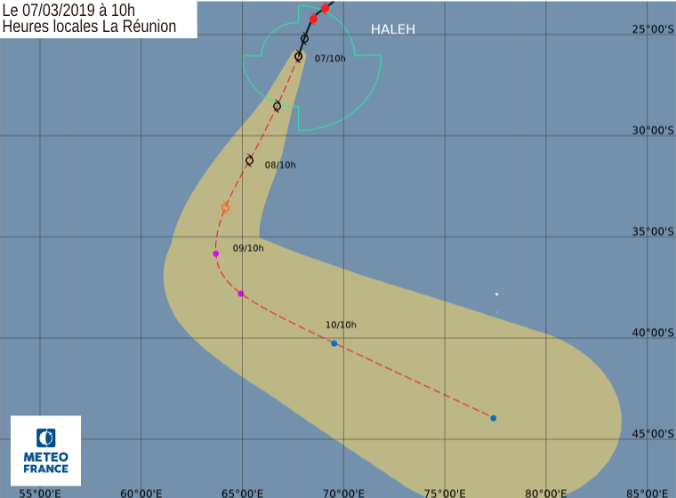 Bye bye Haleh... Le système a été rétrogradé en forte tempête tropicale dans la nuit du mercredi 6 au jeudi 7 mars 2019. En perte de puissance, le phénomène commence également à s'éloigner de La Réunion, à 16 heures il se trouvait 2.780 km à l'est-sud-est de nos côtes. Il se déplace de plus en plus vite vers le sud-sud-ouest à 20 km/h.