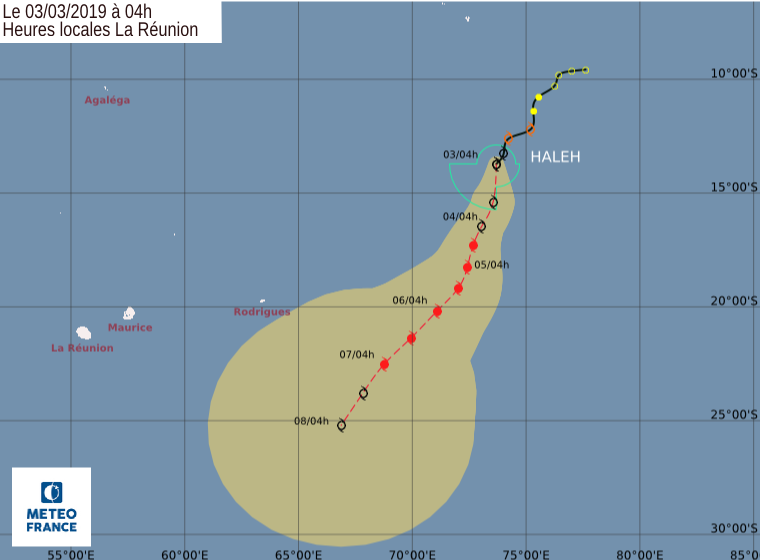 Elle est toujours loin, très loin et ne représente pas de danger... Haleh, devenue dans la nuit une forte tempête tropicale continue de se développer mais ne concerne absolument personne... Dimanche 3 mars 2019, à 16 heures elle se trouvait à 1.970 km à l'est-nord-est de La Réunion. Elle se déplace vers le sud à une vitesse de 15 km/h.