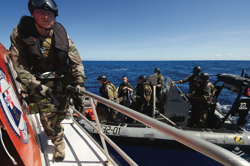 Aidée par son hélicoptère embarqué de type Panther, le bâtiment de guerre intime au navire suspect l'ordre de stopper les machines afin de monter à bord et de procéder à des fouillles.
