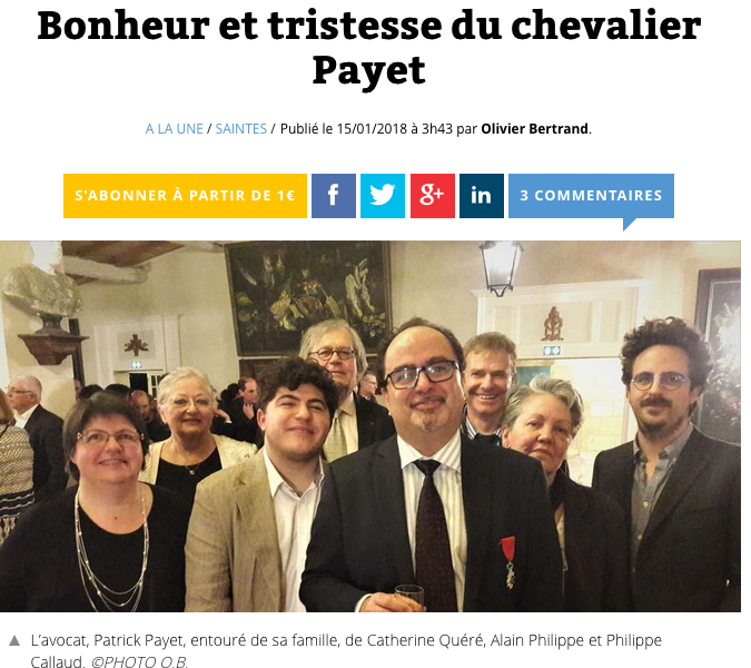 Patrick Payet, natif de La Réunion, avocat et ancien bâtonnier de Saintes, s'est vu remettre l'insigne de Chevalier de la Légion d'Honneur le 8 janvier 2018 des mains d'Alain Philippe, ex directeur du Bureau national interprofessionnel de Cognac.