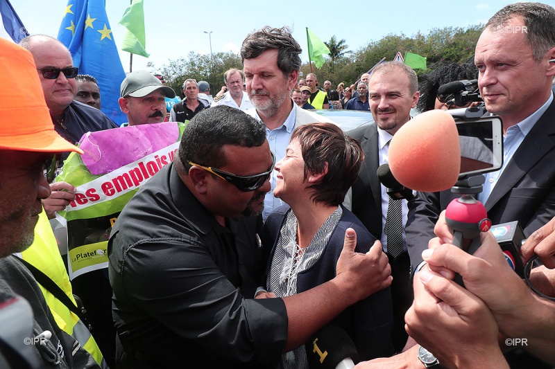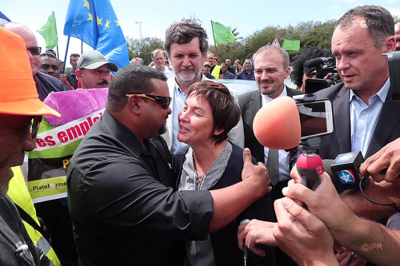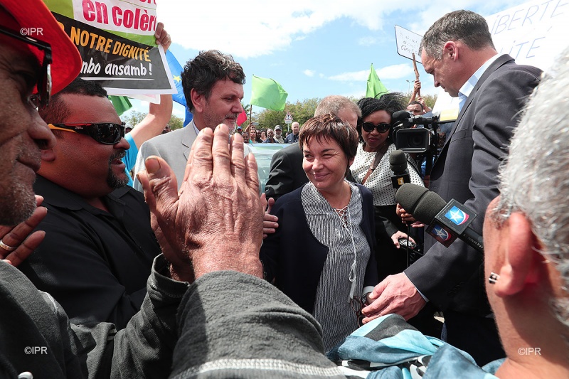 La ministre de l'Outre-mer voit son programme chargé. En visite à La Réunion du 5 au 10 octobre prochain, Annick Girardin abordait la question des contrats aidés dès son arrivée sur l'île. À l'initiative de la plateforme des associations d'emplois verts, près de 400 personnes formaient une chaîne humaine à proximité de l'aéroport Roland-Garros peu avant 10 heures ce jeudi 5 octobre 2017. La membre du gouvernement d'Édouard Philippe sortait de sa voiture pour aller à leur rencontre. Pour sa part le député Insoumis Jean-Hugues Ratenon refusait l'invitation au déjeuner républicain d'Annick Girardin et préférait manger "une barquette républicaine" devant la préfecture. À l'issue de son entretien avec une délégation d'emplois verts, la ministre annonçait le déblocage de 300 nouveaux contrats. Suivez notre live (Photos rb/www.ipreunion.com)