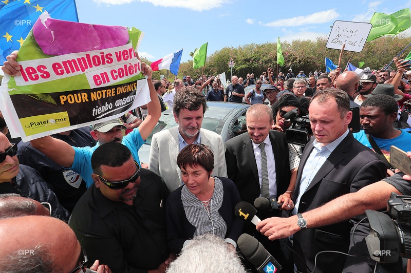 • 10h01 - Annick Girardin sort de l'aéroport. Elle est huée par des manifestants, applaudie par d'autres. Elle est allée directement voir les représentants des emplois verts massés devant l'aéroport, un dialogue s'instaure. La minsitre se dit sensible au problème posé par la baisse des emplois aidés. Suivez notre direct Facebook