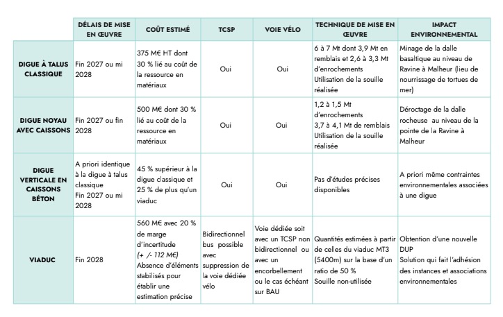 Dans le cas d'une construction digue, plusieurs points sont relevés par le conseil, à commencer par "un volume significatif de matériaux (remblais + enrochements) dont la disponibilité pour la totalité du chantier semble difficile à garantir en l’état actuel de la ressource". Le stockage de ces matériaux semble également poser problème. "De plus, cette solution est difficilement dissociable de l’ouverture de carrières dont un grand nombre de celles qui sont en activité à ce jour, arrivent à épuisement" joute le CCEE, qui redoute également des "convoitises" sur le nouveau marché. Sur le plan environnemental, la construction d'une digue pourrait dangereusement fragiliser le milieu : "cette falaise, la seule de ce type dans l’océan Indien, abrite des cortèges floristiques uniques au monde tels que le bois de paille-en-queue".