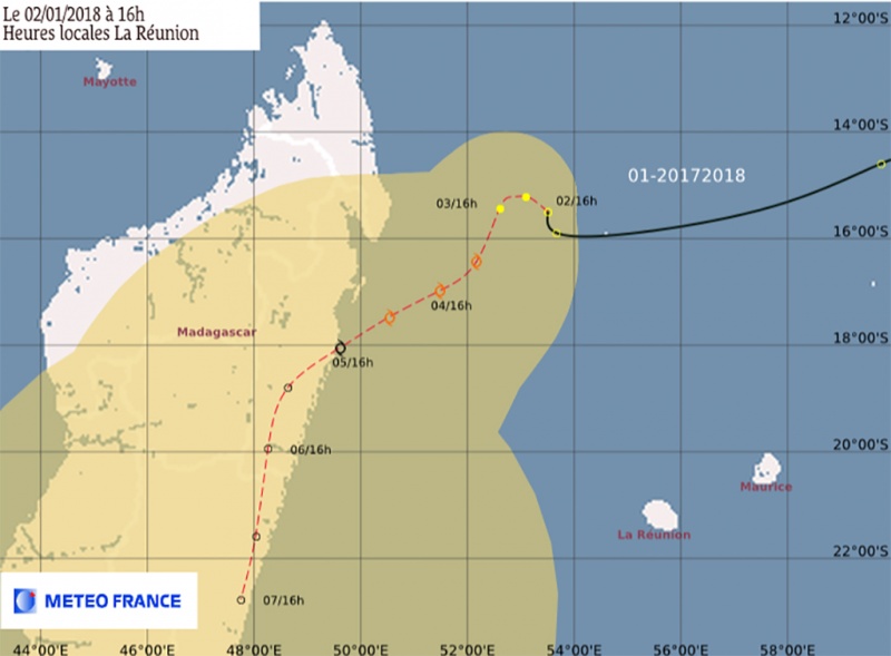 Selon le dernier bulletin de Météo France ce mardi 2 janvier 2018 à 16 heures, la première perturbation tropicale de l'année s'éloigne des côtes réunionnaises et se situe désormais à 630 km au Nord-Ouest de l'île. Le système se dirige vers le Nord-Est de Madagascar où elle devrait perdre de son intensité vers le 5 janvier selon les prévisionnistes. (capture d'écran Météo-France)