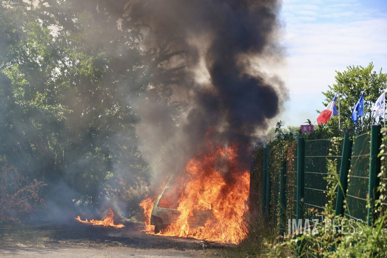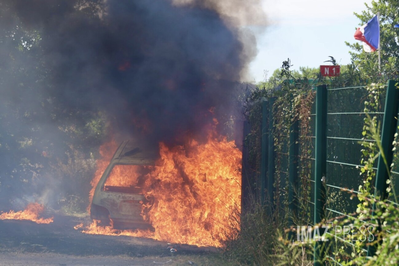 Une voiture est en feu ce mardi 16 juillet 2024 près de l'entrée de la Route du littoral, du côté de La Possession. La fumée déborde sur la Route du littoral, la plus grande prudence est donc recommandée. (Photo sly/www.imazpress.com)