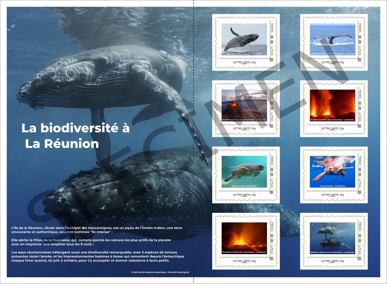 Tiré à 8.000 exemplaires, les Réunionnaises et Réunionnais pourront acquérir ces huit timbres représentant volcan, tortues et baleines dans leurs bureaux de poste habituels et en carrés entreprises.