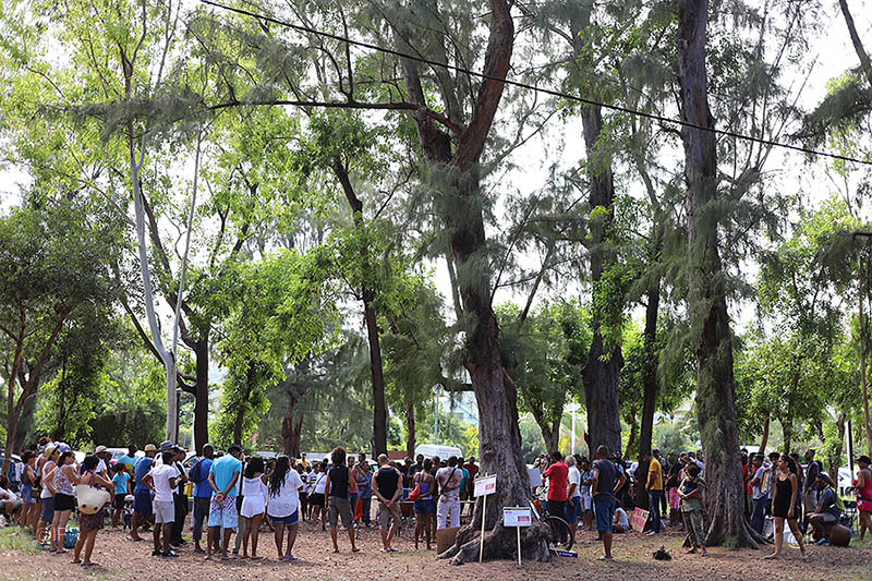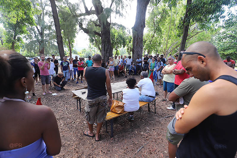 • [DANS LE CALME] Les Réunionnais qui ont répondu à l'appel du KURR (Kolektif Union Rényoné Responsab) sont nombreux à se réunir dans le calme sur l'arrère plage de l'Ermitage contre les paillotes.