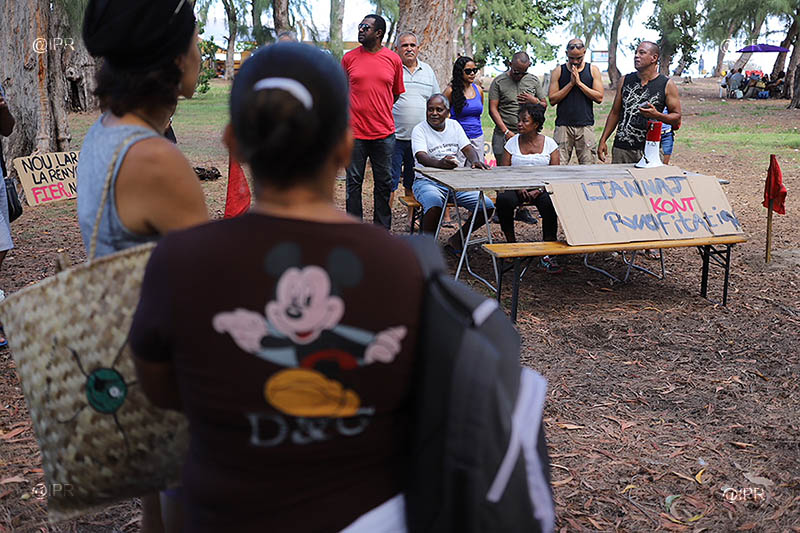 • [ZOT NA PI L'ASSIRANS] "Paillotes illégales". La foule continue de scander "Paillotes illégales". Haut parleur à la main la foule déclare "Zot na Pi lasirans zot na pi rien". Ils ne sont pas venus pour rie