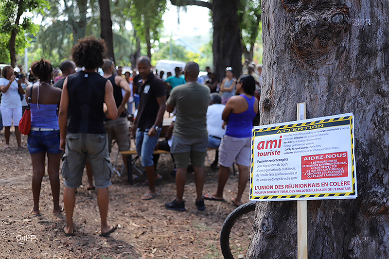 C'est à l'appel du KURR (Kolektif Union Rényoné responsab) que des personnes se réunissent sur l'arrière plage de l'ermitage, panier pic-nique à la main. Les manifestants ont visité les terrasses des paillotes les unes après les autres en scandant "Rényoné en colère! Paillotes illégales!" La foule a entrepris la destruction des terrasses. Toitures en paille arrachées, panneaux en bois cassés, chaises et tables retournées, la foule a décidé de "faire appliquer la loi" par elle-même. Pour rappel, le collectif de la défense du DPM (domaine maritime public) regrette la non application à ce jour de la décision du tribunal administratif de suspendre les autorisations d'occupation temporaires (AOT) du domaine public délivrées à six établissements de plage à l'Ermitage. La juridiction administrative a rendu son arrêt le 16 mars dernier. Ni l'Etat ni la mairie de Saint-Paul n'ont donné suite à cette décision de suspension. Un retard que le Collectif qualifie de "prise de risque inconsidérée".