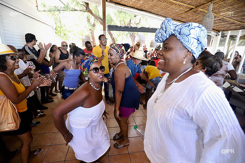 • [OCCUPATION] Les restaurants sont occupés par les nombreuses personnes présentes. Les gens applaudissent et lancent un maloya !! Les gens dansent et chantent. La protesation se poursuit en musique
