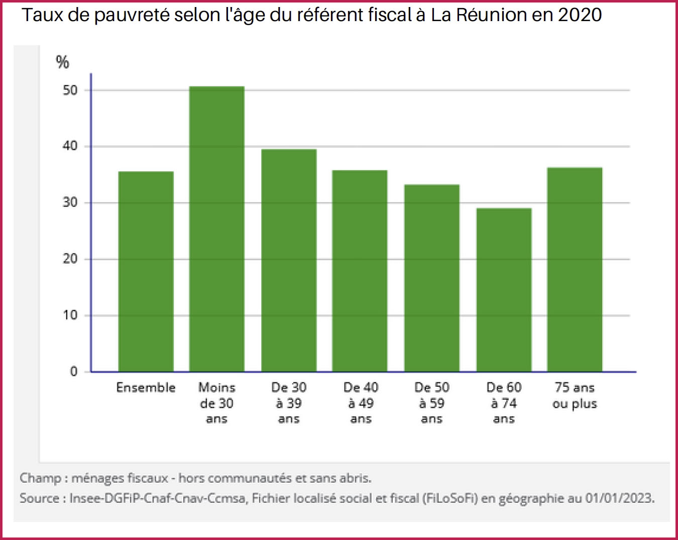 Du fait notamment d'une moindre insertion dans l'emploi, la pauvreté concerne davantage les jeunes. Ainsi, en 2020, dans les ménages jeunes, dont la personne de référence a moins de 30 ans, le taux depauvreté s'élève à 51 % contre 36 % pourl'ensemble de lapopulation.