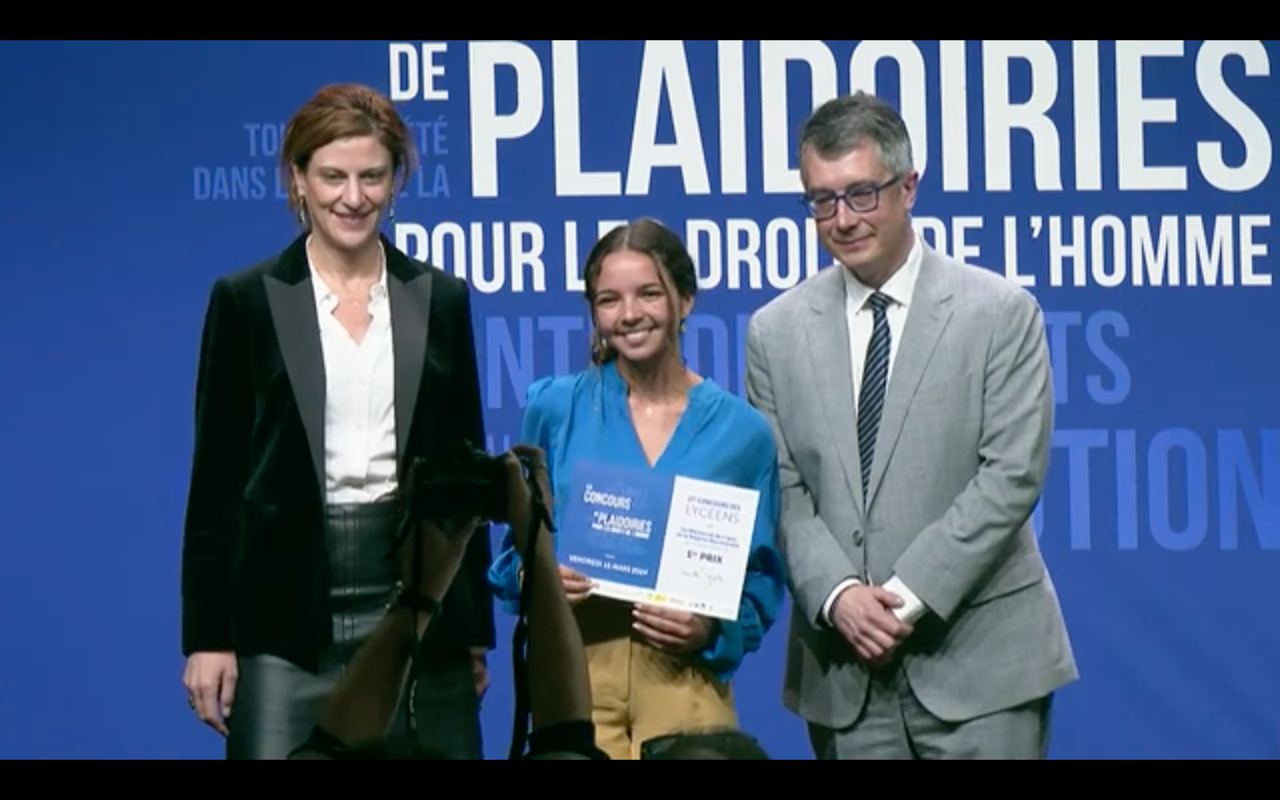 Ils étaient 1500 lycéens, 14 sont venus à Caen, dont Camille . Sa prestation (8’) sur "les enfants volés d’Ukraine" a convaincu le jury. C’est la 3eme fois que la professeur Mme Meynadier amène une finaliste à ce Concours prestigieux de plaidoiries sur les Droits de l’Homme. Le discours de Camille Cozette à sa remise de prix était également un espoir pour tous les jeunes.