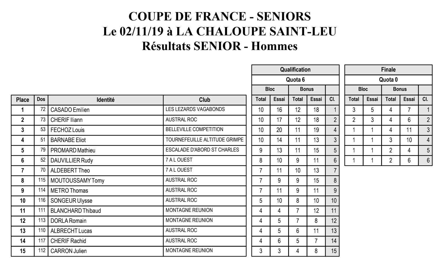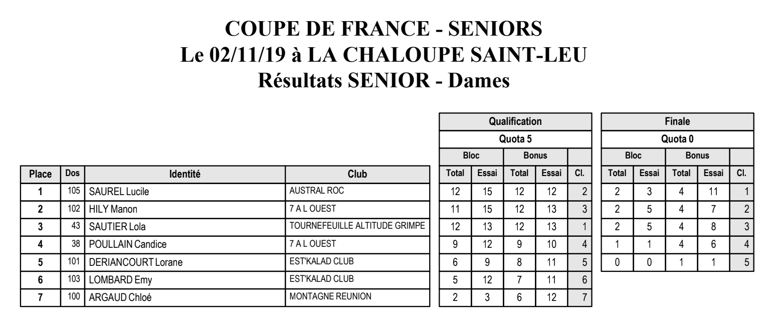 Lucile Saurel, du club Austral Roc, arrive en première place à la Coupe de France de bloc, catégorie seniors, qui se tenait à la Chaloupe Saint-Leu ce 2 novembre 2019. Manon Hily, du club 7 A L'ouest, arrive en deuxième place. Chez les hommes le Réunionnais Iliann Chérif remporte la médaille d'argent. Vous retrouverez ci-dessous les résultats et des photos de la finale séniors de la Coupe de France de Bloc 2020.