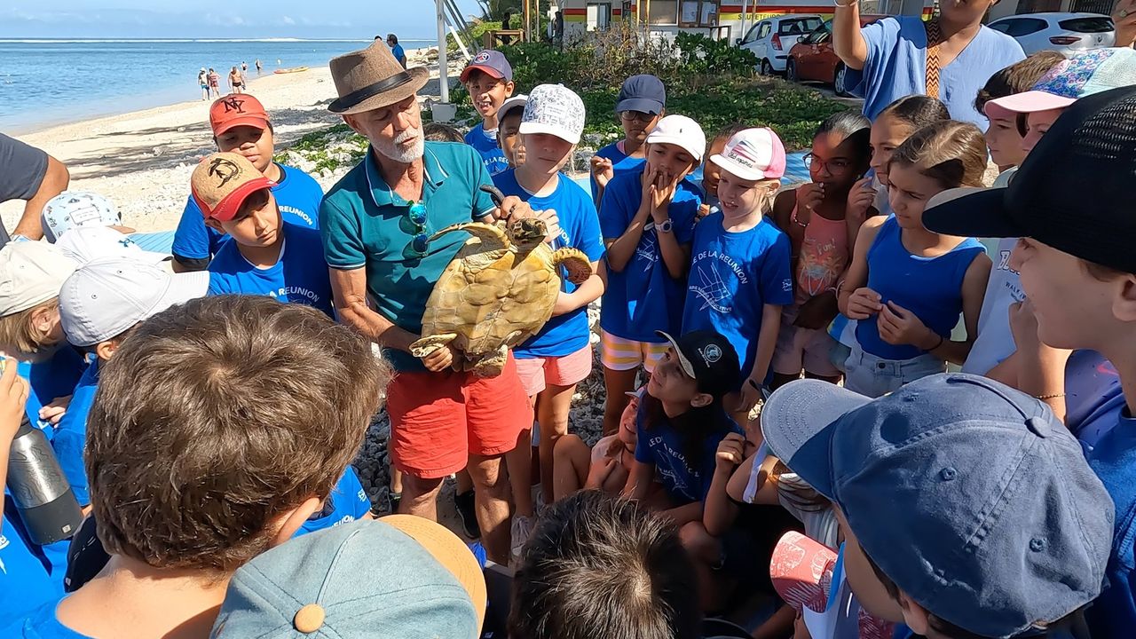 Ce jeudi 3 octobre 2024, la tortue imbriquée baptisée Timlie a regagné l'océan, accompagnée des élèves de l'aire marine éducative de La Saline. La tortue était au centre de soins depuis le 15 août après avoir avalé un hameçon. Nous publions ci-dessous le post de Kélonia (Photo : Kélonia)