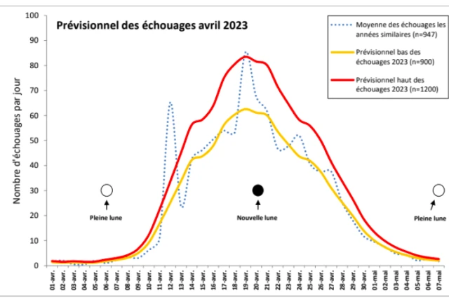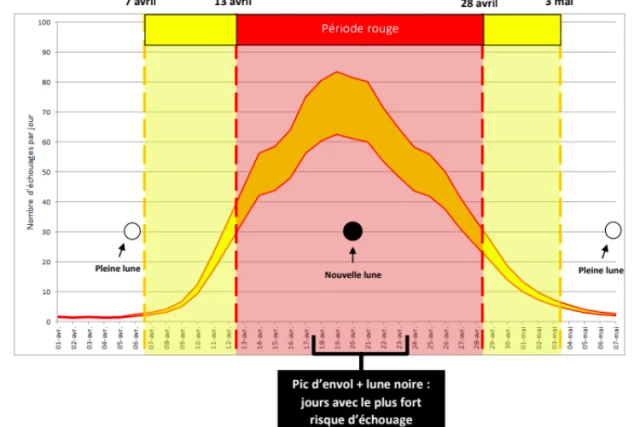 - Période « rouge » du 13 au 28 avril inclus : cette période de 16 nuits consécutives est la plus critique, avec 83 % des échouages attendus. Durant cette période, les efforts d’extinction des éclairages doivent être maximaux et intervenir dès 19 H : pas d’événements en soirée nécessitant des éclairages, extinction impérative des éclairages sportifs avant 19 H.