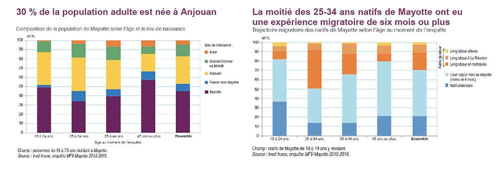 L’émigration est également forte. En 2012, 26 % des adultes natifs de Mayotte résidant en France vivent hors du département. De plus, la moitié des 25-34 ans natifs de Mayotte ont eu une expérience migratoire de six mois ou plus.