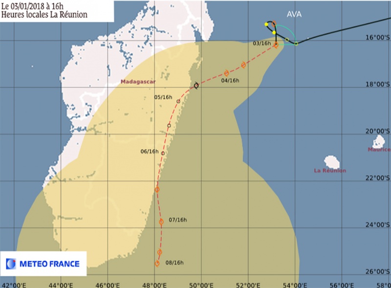 Selon le dernier bulletin émis par Météo-France ce mercredi 3 janvier 2018 à 16 heures, la tempête tropicale Ava qui se dirige toujours vers l'Est de Madagascar se situe à 570 km de La Réunion. Les prévisionnistes indiquent par ailleurs que dans les prochains jours, une cyclogenèse, processus par lequel un système cyclonique prend naissance, pourrait avoir lieu à l'Est de La Réunion aux environs des positions 12 Sud / 85 Est.