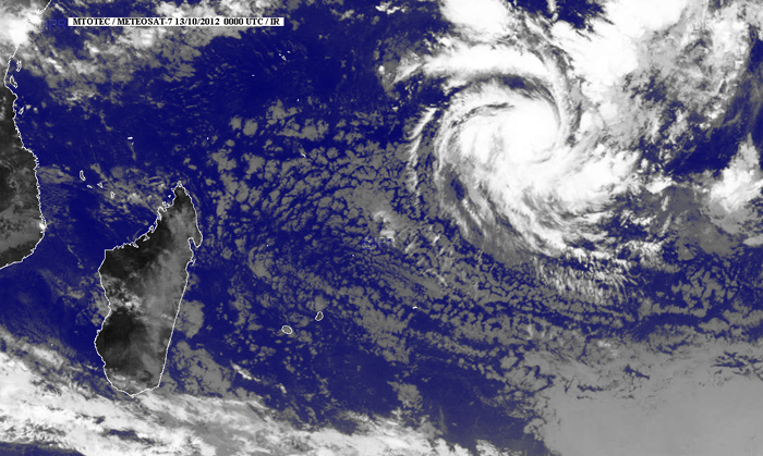 Le système dépressionnaire suivi par les services de Météo France a été baptisé Anaïs. Devenu tempête tropicale modérée, il se situait, ce samedi 13 octobre 2012, à 16 heures à 1795 km au nord-est de La Réunion, plus précisément par les points 10.1 Sud et 68.1 Est. Le système poursuit sa route vers l'ouest sud ouest à la vitesse de 20 km/h. Il ne présente aucun danger pour la Réunion dans les prochaines 72 heures. (image satellite Mtotec)