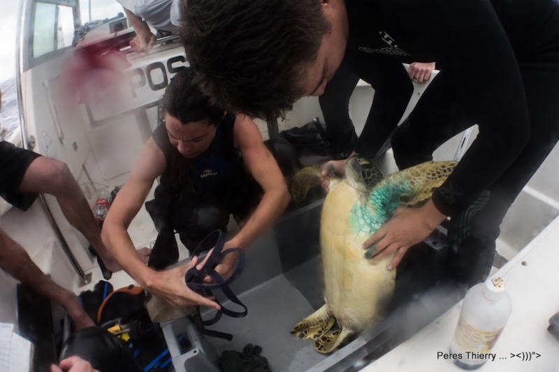 Le hameçon entravait la nage de la petite tortue depuis près de deux mois. C'est un apnéiste d'élite qui l'a capturée afin que les équipes puissent procéder aux soins.